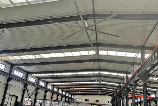 2、大型工業風扇通過緩慢旋轉翼型扇葉,推動大量空氣流動,垂直向上向下送風達到847800 m/h,無死角地向車間各個角落輸送空氣;